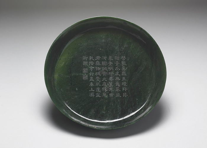 在中亞當地原作為承裝「馬湩」(馬乳汁)的玉盤,盤底平整,玉料厚,呈現不均勻的碧綠色,雖然整體光素,但盤心內壁刻有隸款御製詩文,這是乾隆三十六年(1771)清高宗的詩作,內容點出了玉盤無紋的特徵。