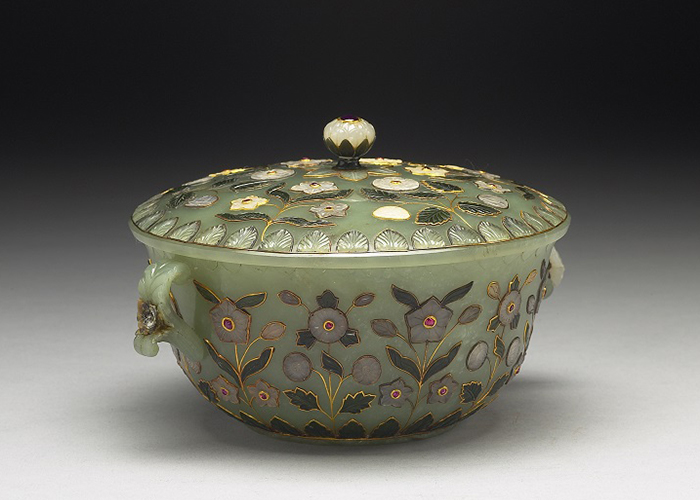 十六世紀,帖木兒後裔巴布爾(1526-1530)南下至印度北部建立了蒙兀兒帝國(1526-1857),第四、五代國君賈汗吉(1605-1627)與沙加罕(1627- 1657)兩帝在位時,藝術文化高度發展,建築成就非凡,同時也締造了玉器製作的高峰。蒙兀兒玉工運用出神入化的淺浮雕技術,經常在碗、盤、杯等食器底部呈現「層花疊葉」般的生機盎然;而「鑲金釘寶撫無迹」的金絲鑲寶石裝飾則多用於刀劍的玉把柄或盒、壺、罐等。若將《清高宗御製詩文集》中屢屢可見的「痕都斯坦玉」一詞,與現存帶有御製詩的玉器對應,可以發現讓皇帝醉心歌詠、並為之配製錦袱與盒匣的玉器大多來自蒙兀兒帝國。乾隆皇帝曾在御製詩中指稱這批玉器是「貴人所用」,也反映了蒙兀兒帝國最盛期極度奢華的風氣。
